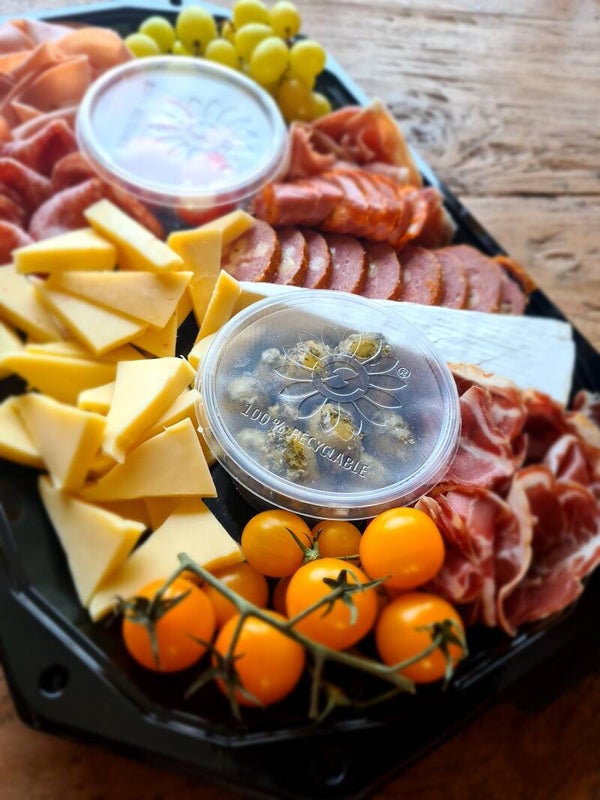 De box wordt geleverd als serveerschaal met deksel. Sausjes en dips kunnen apart worden afgesloten.
